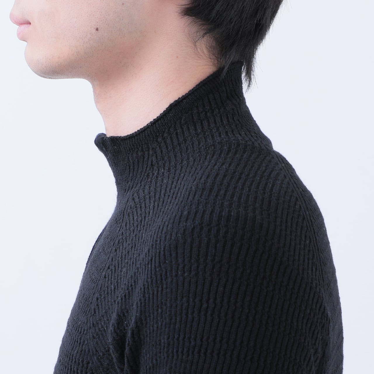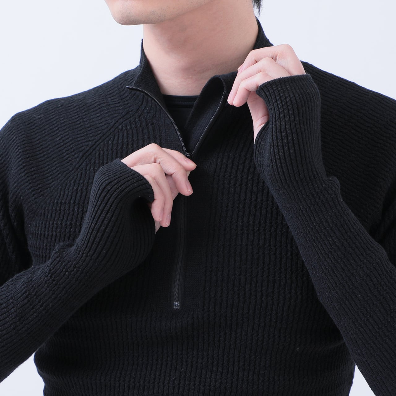 通常のリブ編みに比べ、キックバックが少ないため、あらゆる体系に、ストレスなくフィットします。ホールガーメント製法で作ることで縫い代がないので、ストレスフリーであり、新感覚の着用感です。ハイゲージで編んでいるので、中厚手のベースレイヤー感覚で着用可能です。伸縮するリブ組織なので、あらゆる体型にフィットします。