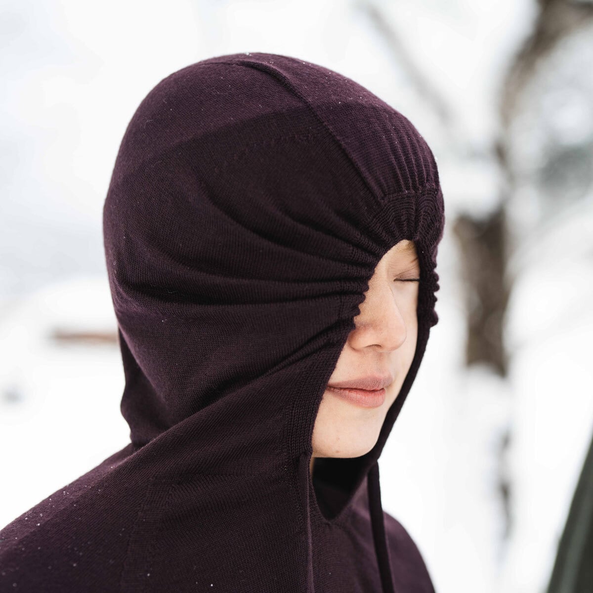 フードは上下を向いても追従するように大きめにしています。またビーニーの上からでもがばっとかぶれるのもポイント。