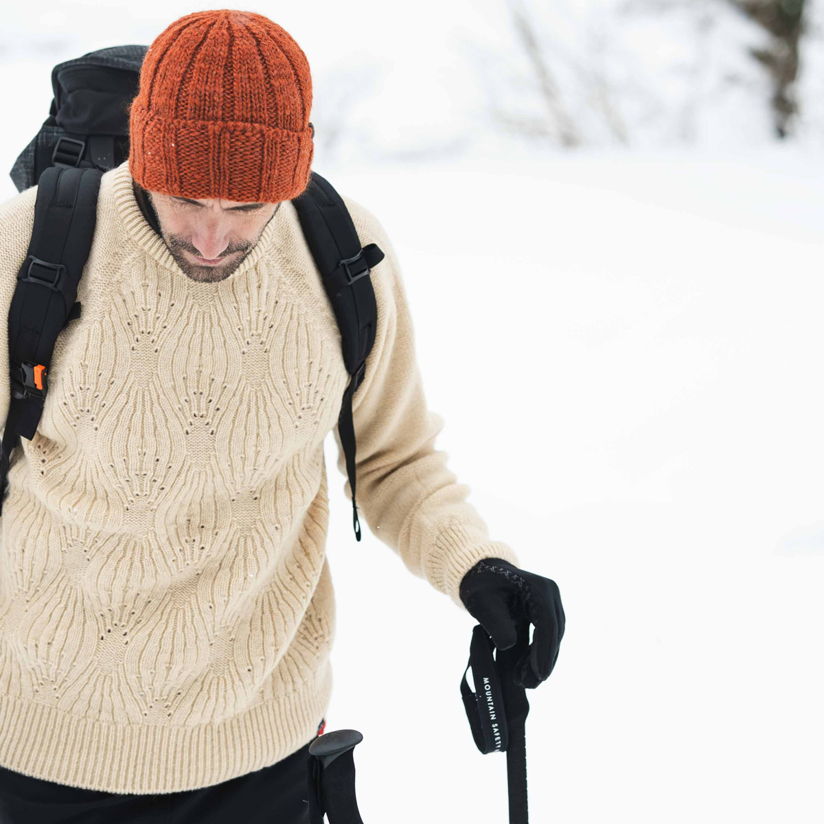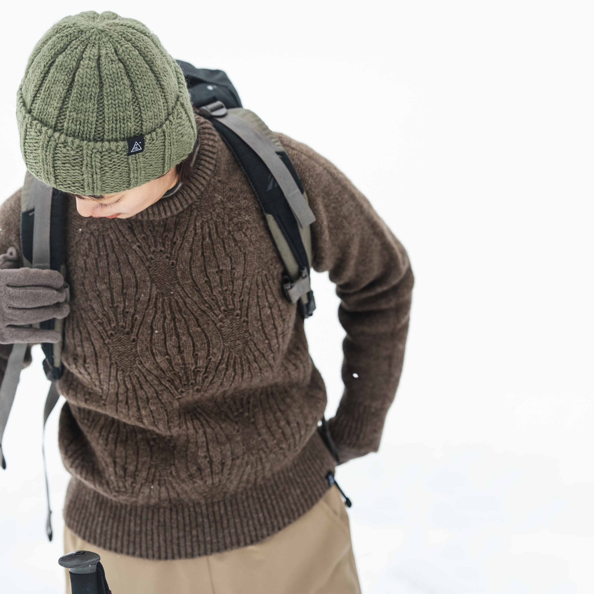 山のスタイルも多様化してきていますが、こんなセーターを着てチョロっと紅葉見に行く、とか。エベレストに思いを馳せながら。なんてロマンがあって良いと思うんですよね。そんな気持ちになれるセーターだと思います。