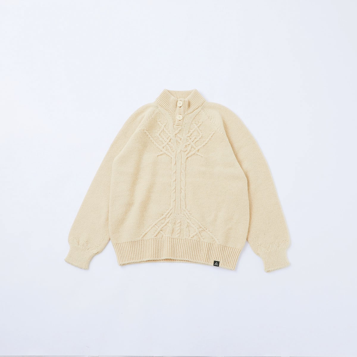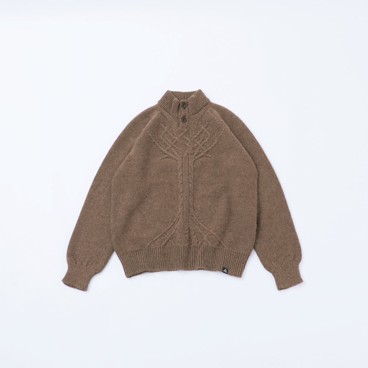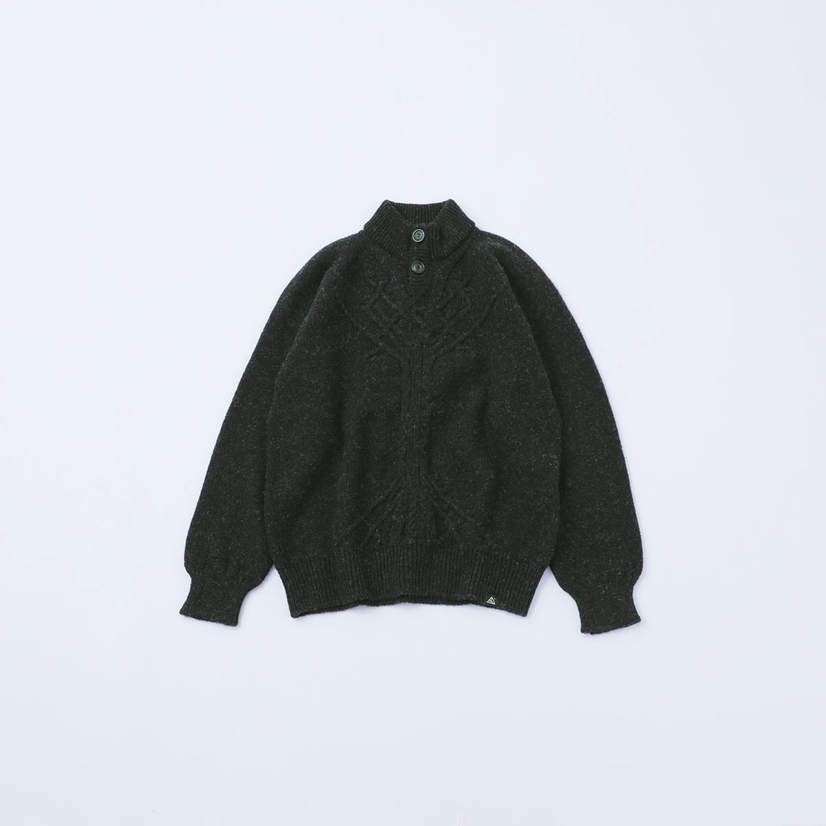 それは質実剛健な素材や大衆性など、様々な価値観やストーリーが絡み合って成り立つもの、と思っておりますが、今回のアルブルセーターでは、極めて個人的な小さいコミュニティの家族が子供の成長を願って編んだハンドニット。というストーリーのイメージで作っています。