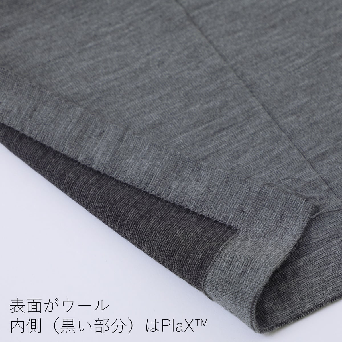 以前からトライしたかった素材であるPlaX™を使用したアイテム。この企画はよりライトアウターとしての役割を持たせる意味でもウールとプレーティングして編み立てています。