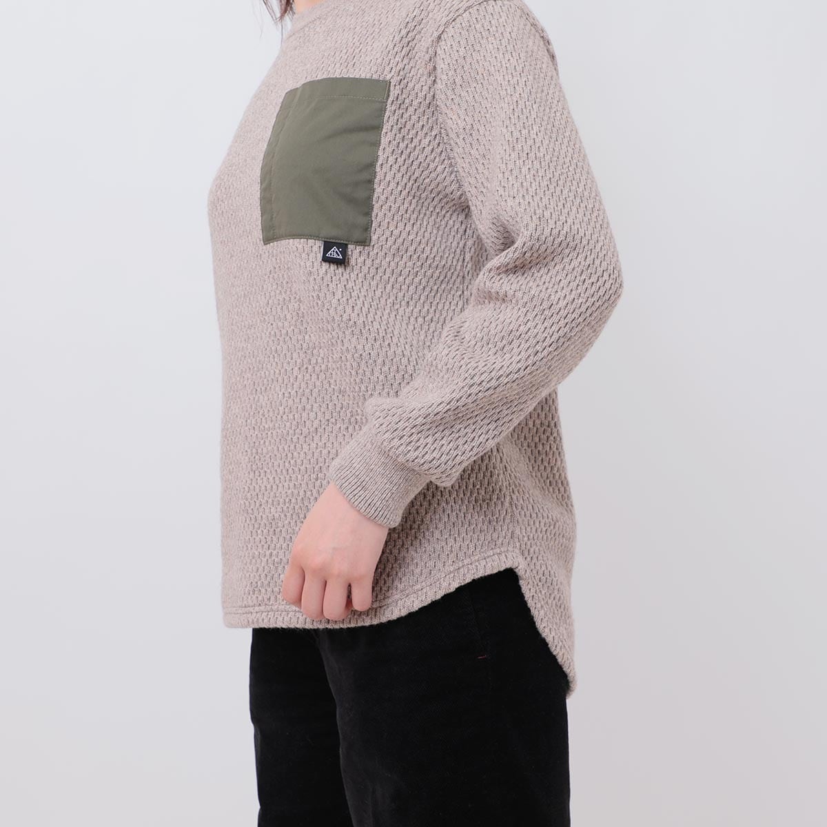 ヘムライン(裾)を、ラウンドさせることで、ボトムスポケットにアクセスしやすいよう、デザインされている。