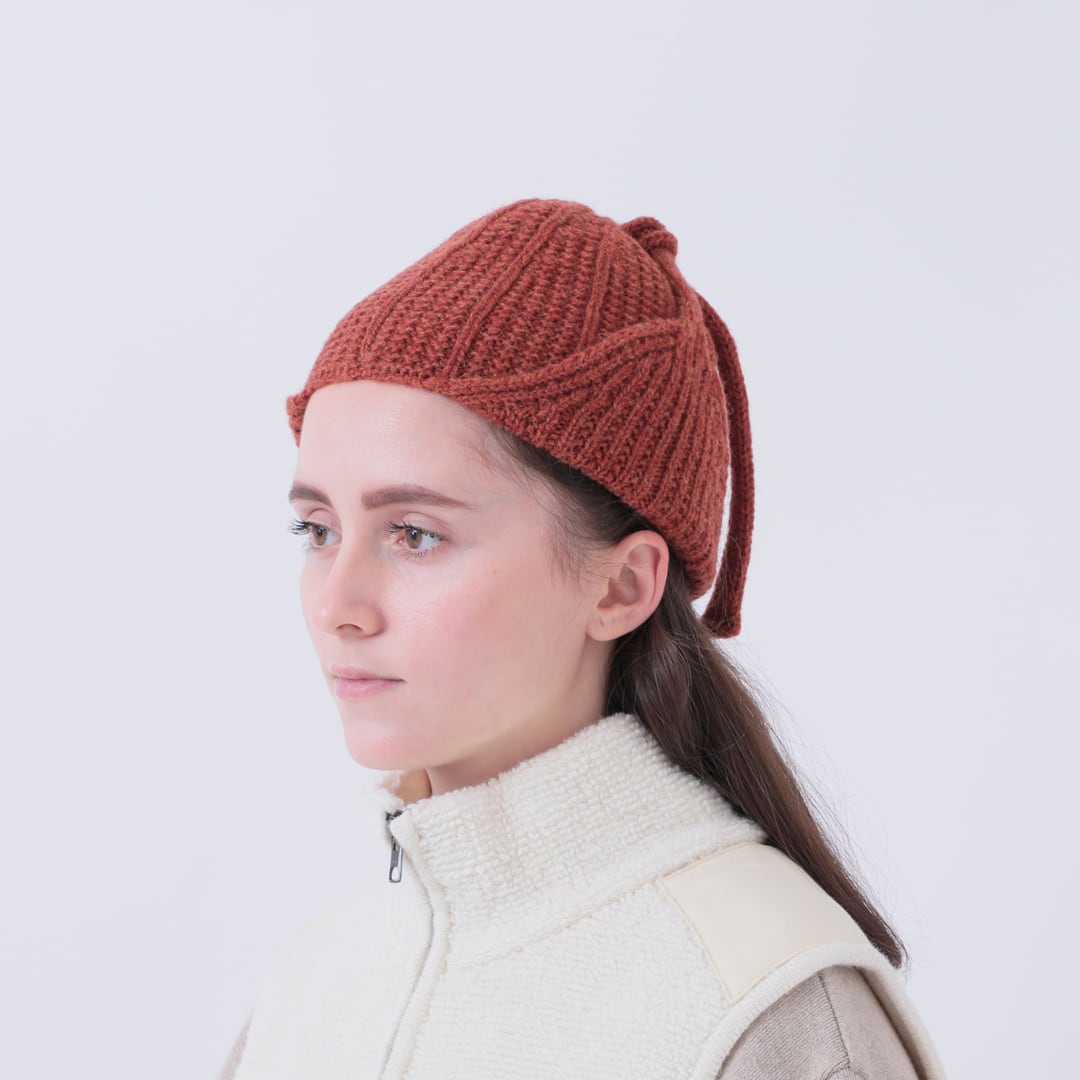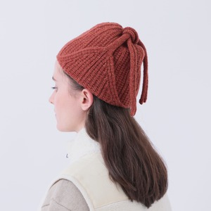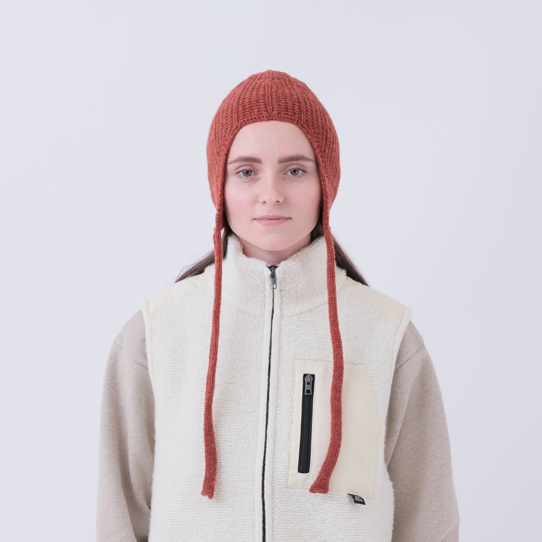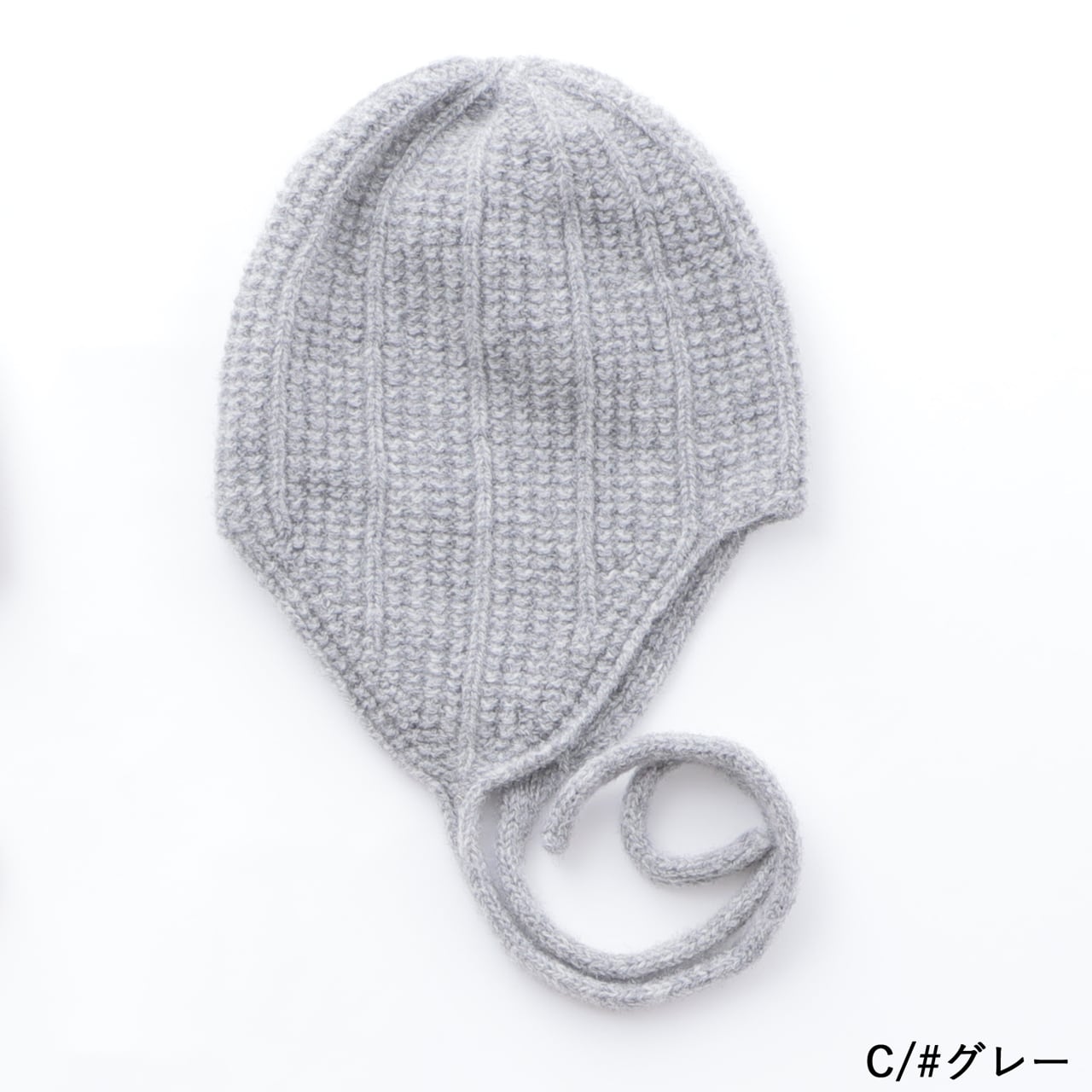 寒い日に嬉しい、編み続きの耳当て付きニット帽です。