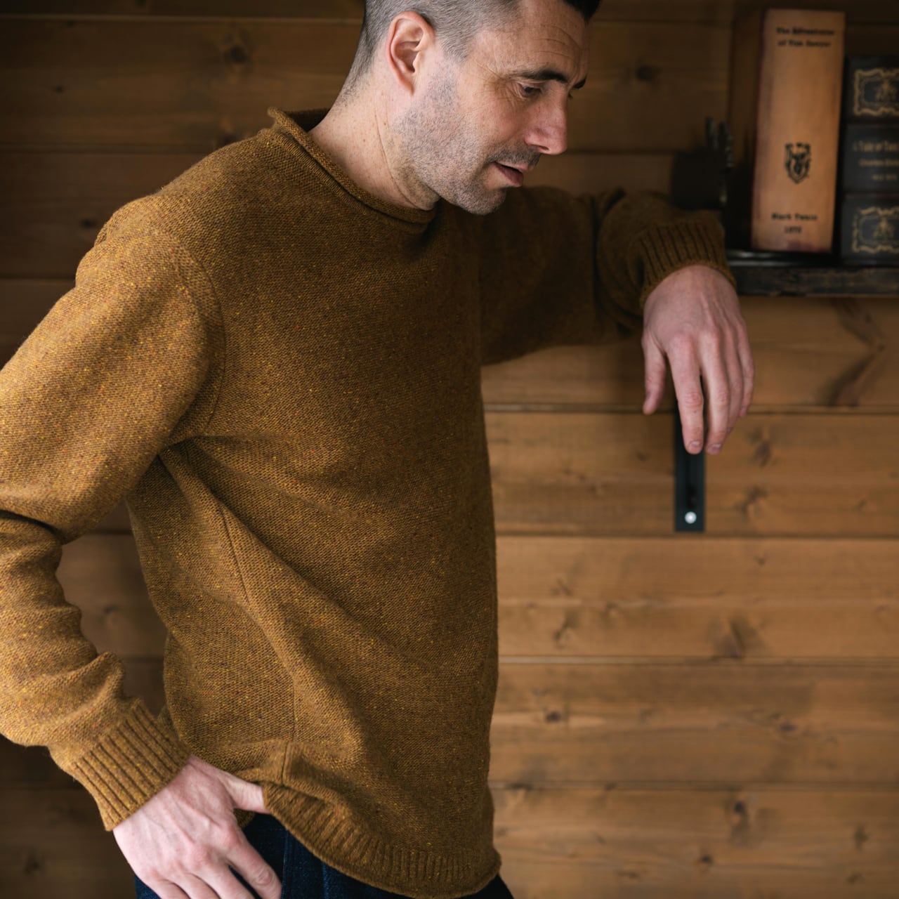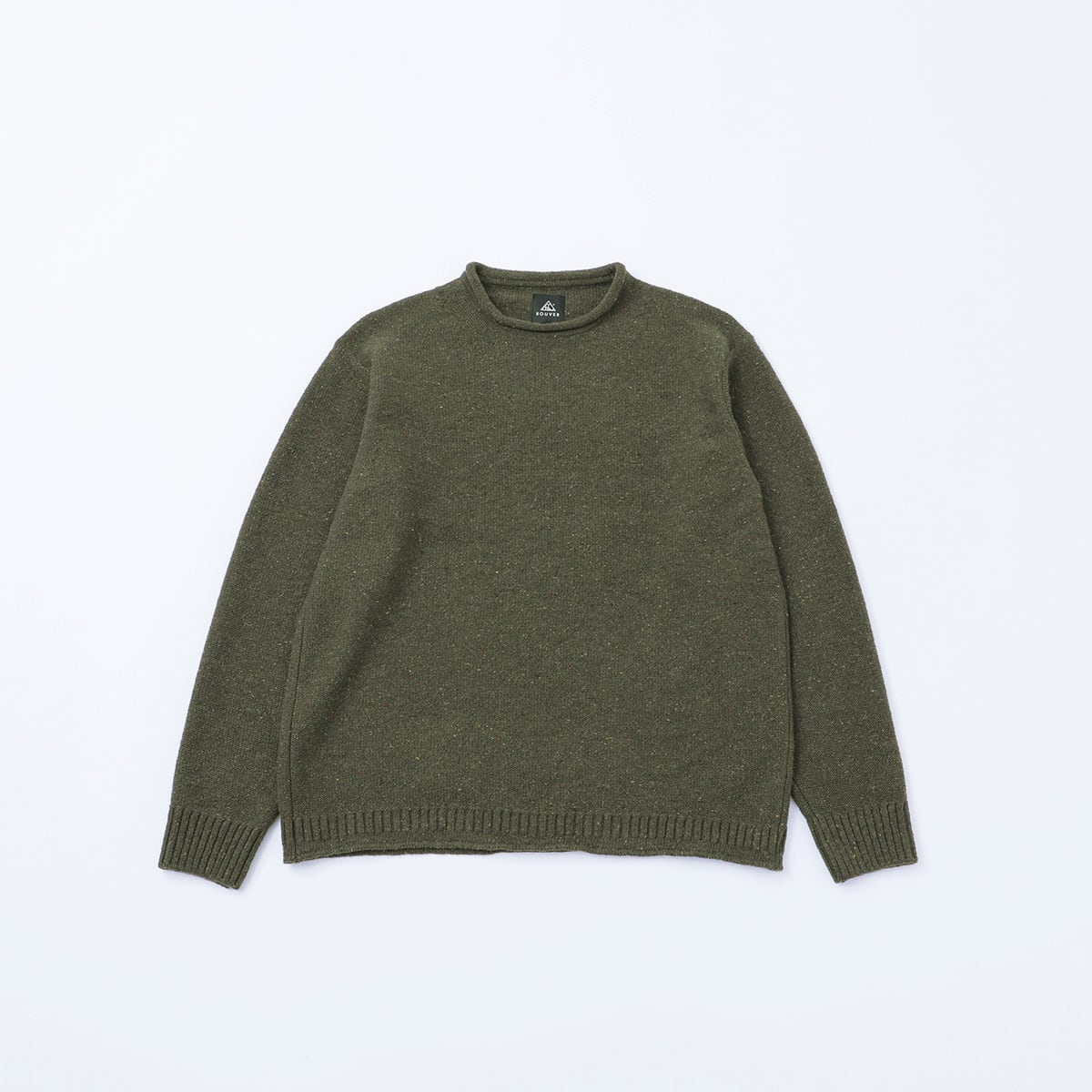 クラシックなカール衿に、カラーネップが古着っぽい雰囲気のあるセーターです。