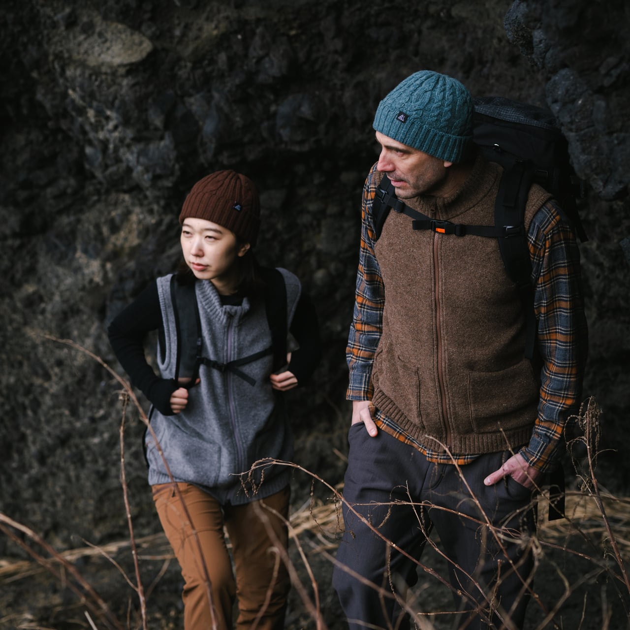 リブ編みのハイネックや、ファスナーの顎あたりを防止するチンガード、持ち出し風防、ダブルファスナーなど活動時に気になる面のディテールにこだわりました。ファスナーの金具、ふとした時に顎にあたると冷たいんですよね、、、